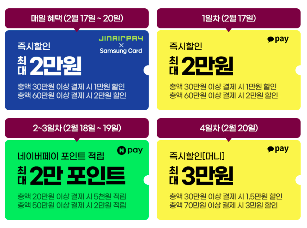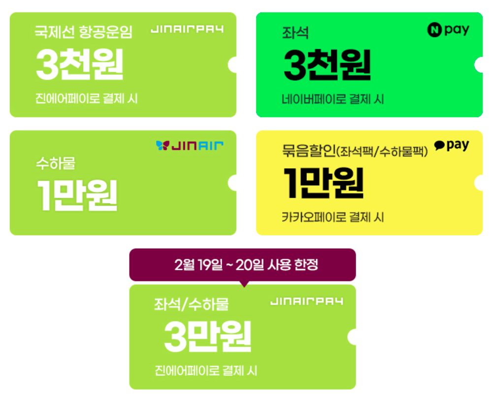 - 간편 결제(진에어 페이, 네이버 페이, 카카오 페이) 이용 시 최대 1만원 즉시 할인